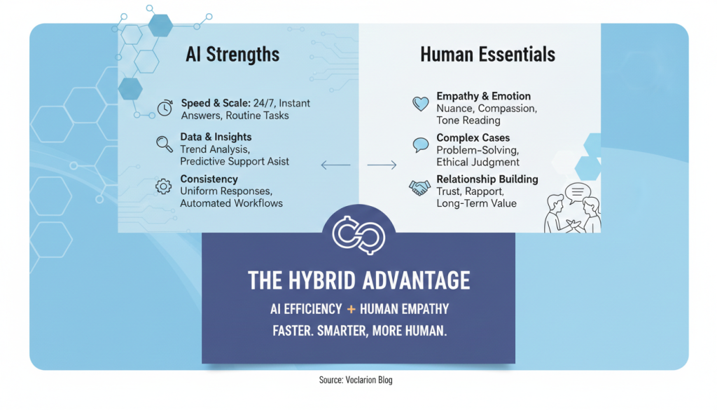 - The limitation of pure automation: While AI offers 24/7 speed and handles routine tasks at scale, it lacks the empathy, ethical judgment, and nuance required for complex or sensitive customer situations.