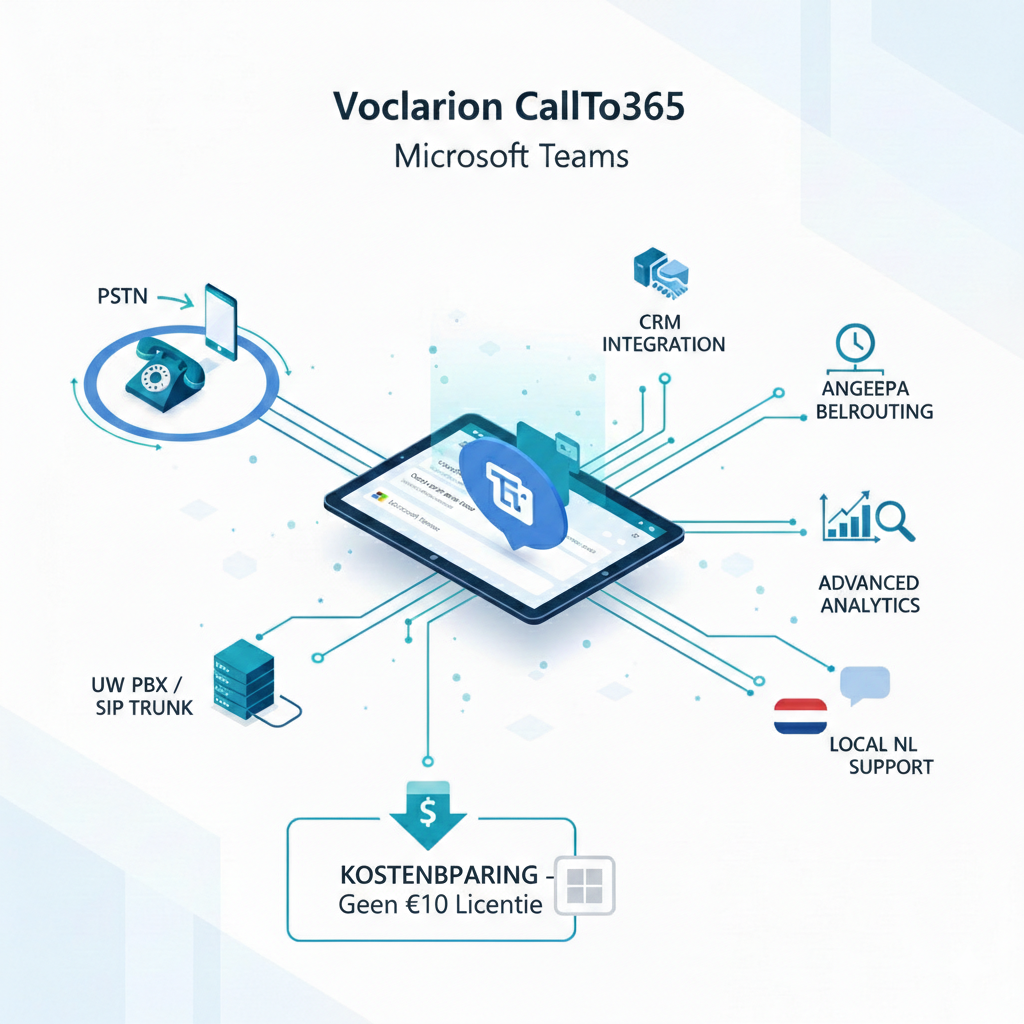 Voclarion CallTo365 gebruikt Microsofts Direct Routing-architectuur om telefonie van bedrijfsniveau direct in Teams te brengen, zonder dat u per gebruiker Microsoft Calling Plan-kosten hoeft te betalen.